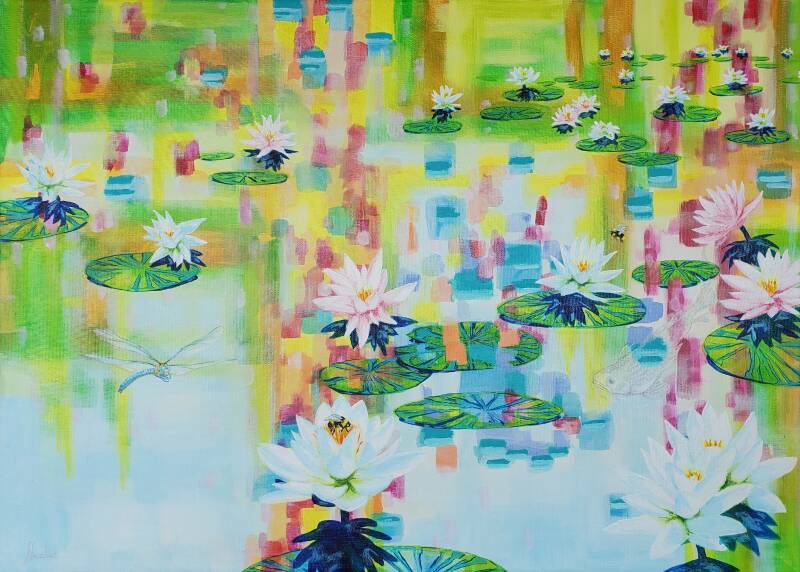 Reimagining the timeless water lily motif through dappled sunlight and shifting reflections that animate the rich habitat of a garden pond.