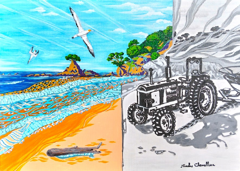 Each of my paintings offers a unique narrative, capturing two contrasting visions of our world. The black and white areas reflect the present—a world in need of reflection, awareness, and positive change. Opposing this is the vivid, colorful section, which reveals the beauty that often goes unnoticed: a vision of what our world could be. This part is inspired by the natural landscapes of New Zealand and the richness of Māori culture.